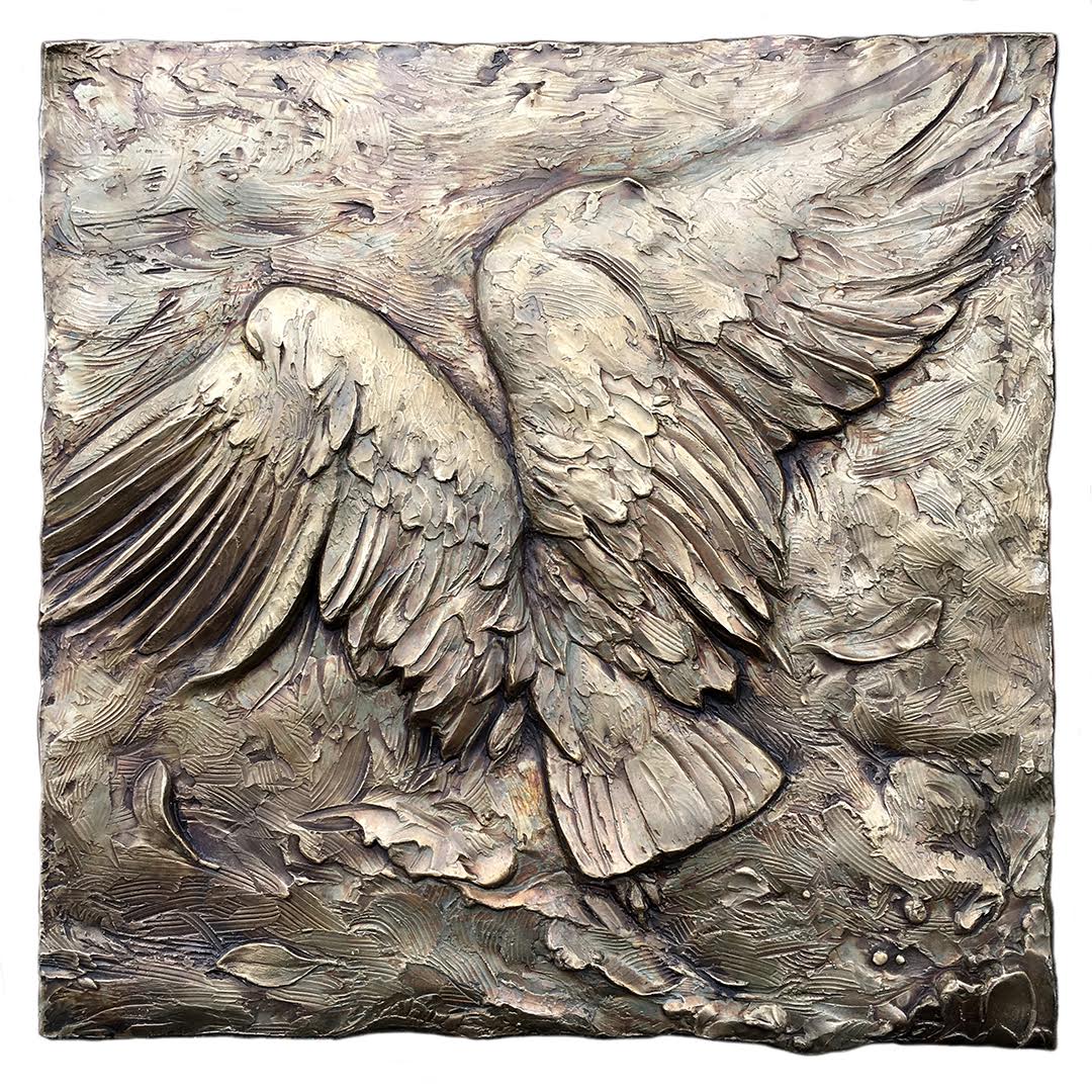 All fluster and feathers, and a startled lurch upward, a bird takes off from the water. The feathers of the tip of the left wing louver together to maneuver with precision. A trailing foot skims the water and leaves a wake. Sunlight filters down through the trees. I was inspired by a photograph I took in the bird sanctuary at Brookgreen Gardens. All emphasis is on the marvel of wings and flight. Soft feathers full and round, bursting with life from the inside out. I worked quickly on my feet with long handled tools to bring a feel of energy and movement. A light patina let's the maximum amount of light bounce off the metal.